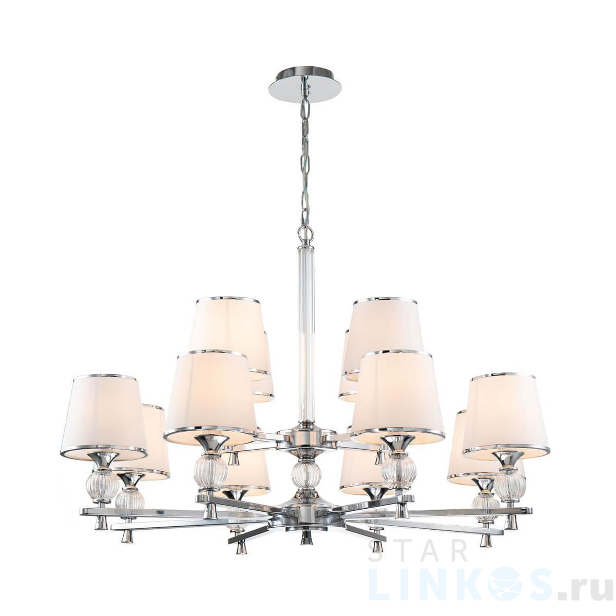 Поставщик рекомендует использовать лампы накаливания с цоколем E14 для освещения площади 26,7 м2. Подвесная люстра Favourite Aureola 2873-12P в используется в интерьере гостиной с установкой на потолок.
