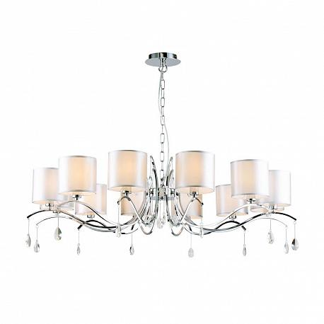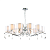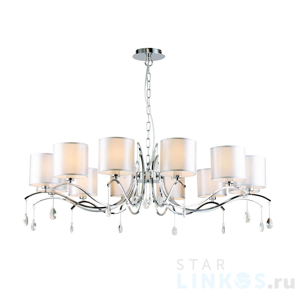 Поставщик рекомендует использовать лампы накаливания с цоколем E14 для освещения площади 26,7 м2. Подвесная люстра Favourite Low 2866-12P в стиле арт-деко используется в интерьере гостиной с установкой на потолок.