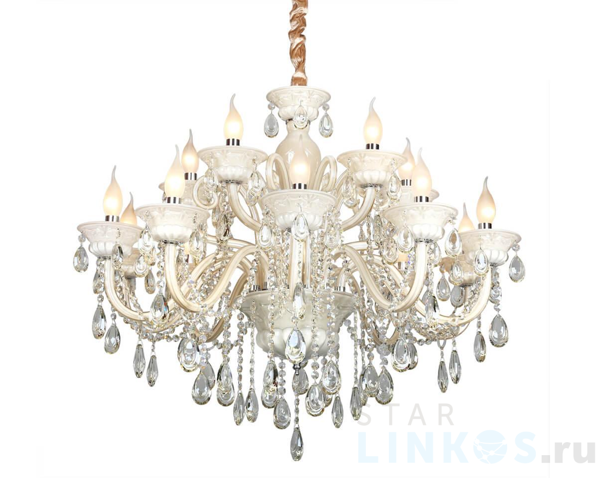Поставщик рекомендует использовать лампы накаливания с цоколем E14 для освещения площади 34 м2. Подвесная люстра Omnilux OML-30503-15 в классическом стиле используется в интерьере гостиной с установкой на потолок.