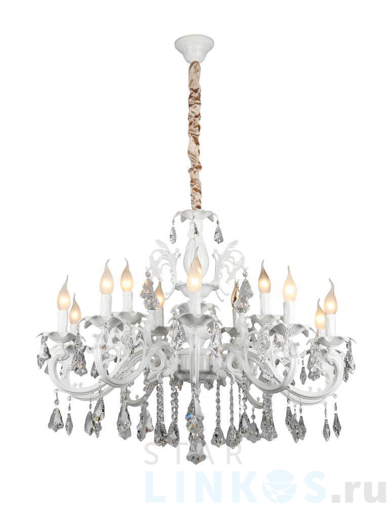 Поставщик рекомендует использовать лампы накаливания с цоколем E14 для освещения площади 34 м2. Подвесная люстра Omnilux OML-30807-15 в классическом стиле используется в интерьере гостиной с установкой на потолок.