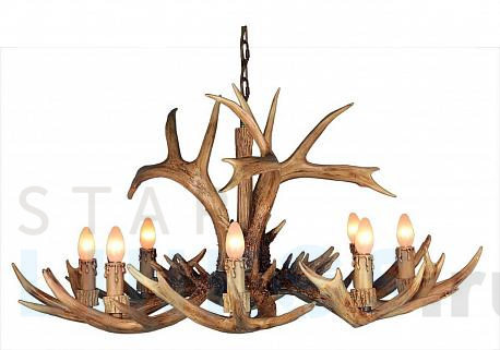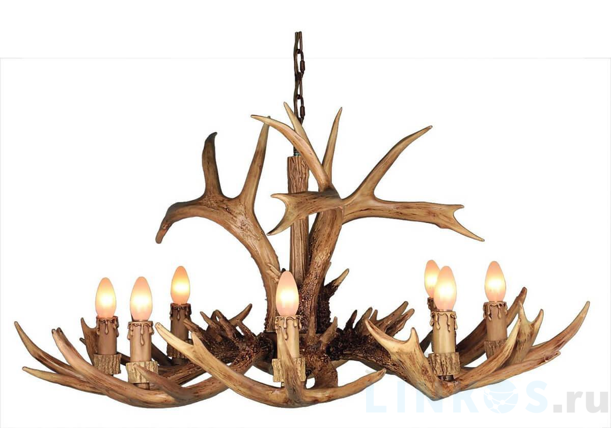 Поставщик рекомендует использовать лампы накаливания с цоколем E14 для освещения площади 27 м2. Подвесная люстра Omnilux OML-52003-08 в кантри-стиле используется в интерьере кафе и ресторанов с установкой на потолок.
