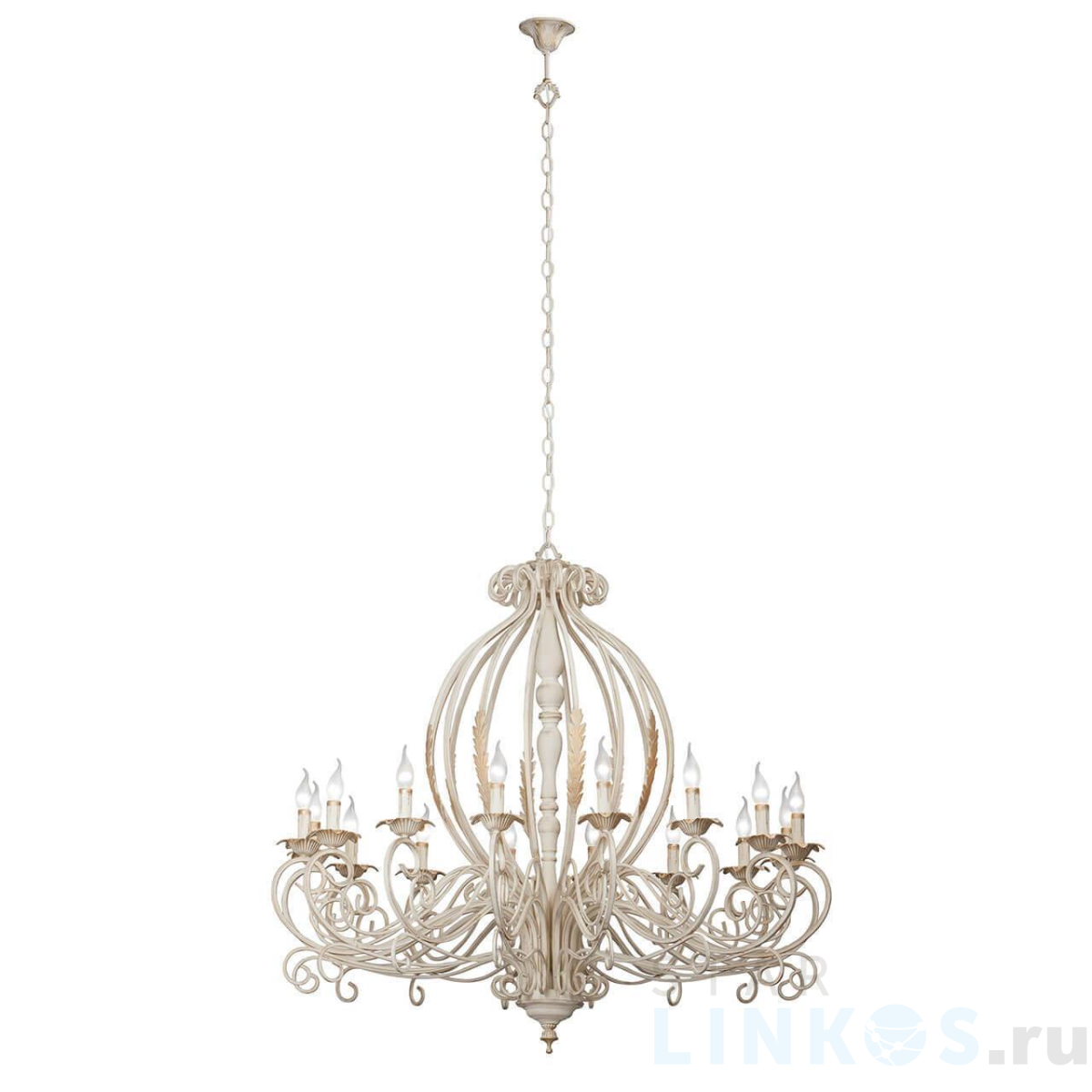 Поставщик рекомендует использовать лампы накаливания с цоколем E14 для освещения площади 35,6 м2. Подвесная люстра Vitaluce V1023/16 в классическом стиле используется в интерьере гостиной с установкой на потолок.