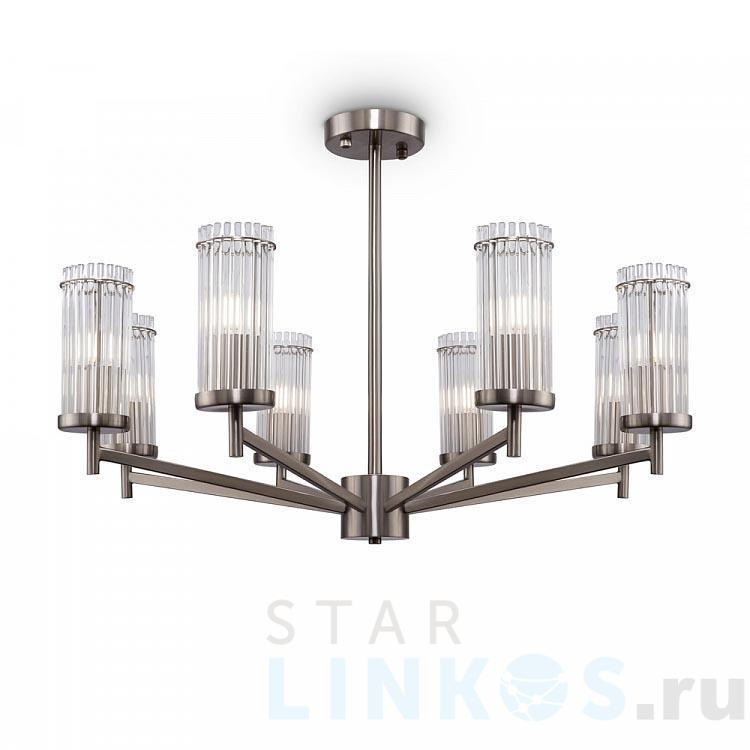 Поставщик рекомендует использовать лампы накаливания с цоколем E14. Подвесная люстра Freya Manisa FR5036PL-08N в используется в интерьере гостиной с установкой на потолок.