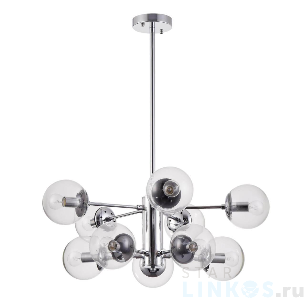 Поставщик рекомендует использовать лампы накаливания с цоколем E14 для освещения площади 33,3 м2. Подвесная люстра Freya Richard FR5596PL-10CH в стиле лофт используется в интерьере гостиной с установкой на потолок.