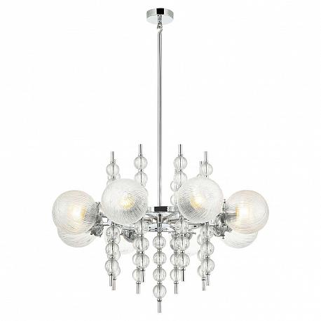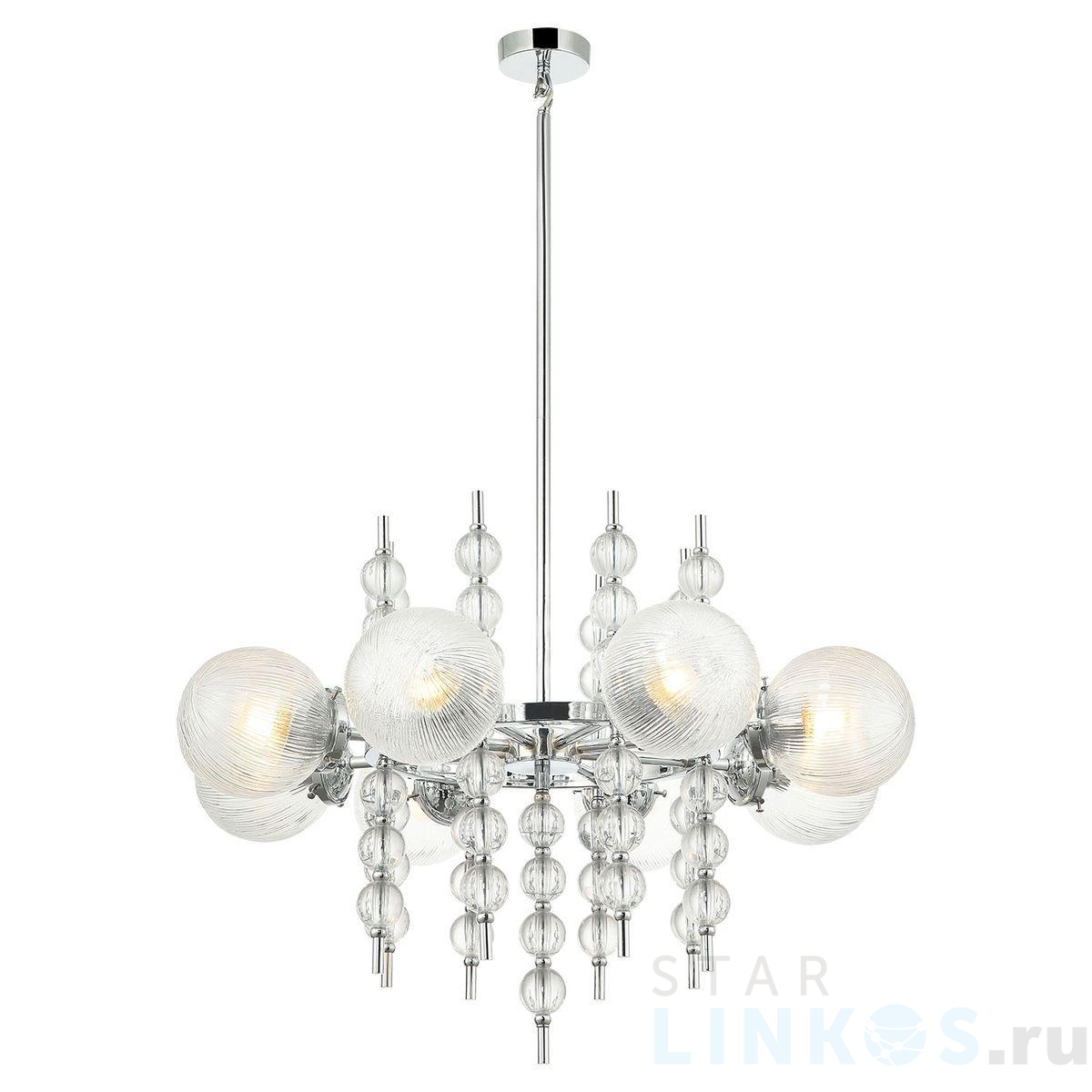 Поставщик рекомендует использовать лампы накаливания с цоколем E27. Подвесная люстра Lussole Loft LSP-8528 в стиле арт-деко используется в интерьере гостиной с установкой на потолок.