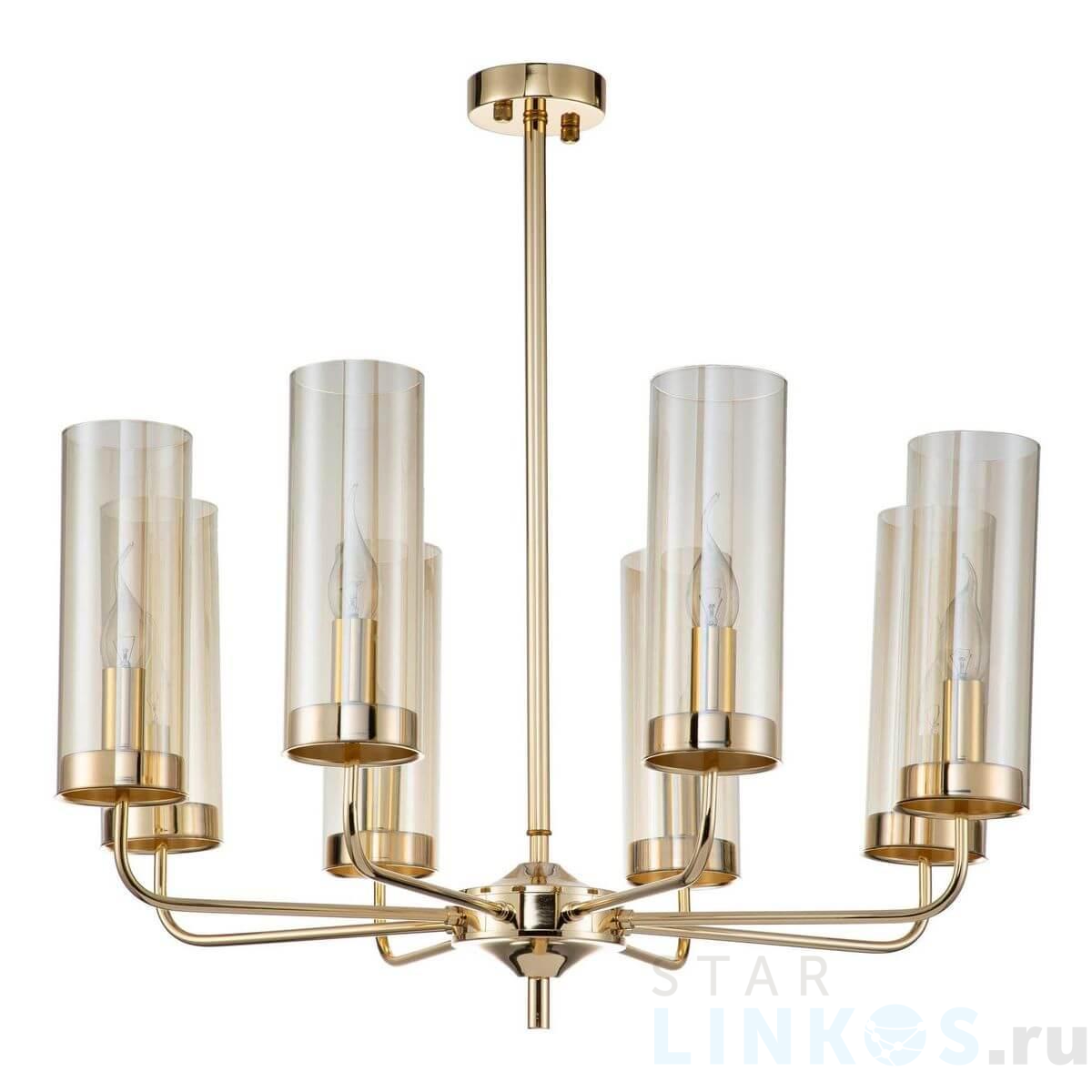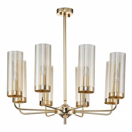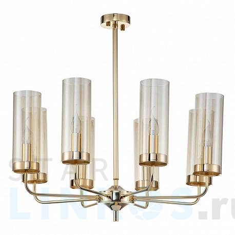Поставщик рекомендует использовать лампы накаливания с цоколем E14. Подвесная люстра Moderli Metric V10021-8P в современном стиле используется в интерьере гостиной с установкой на потолок.