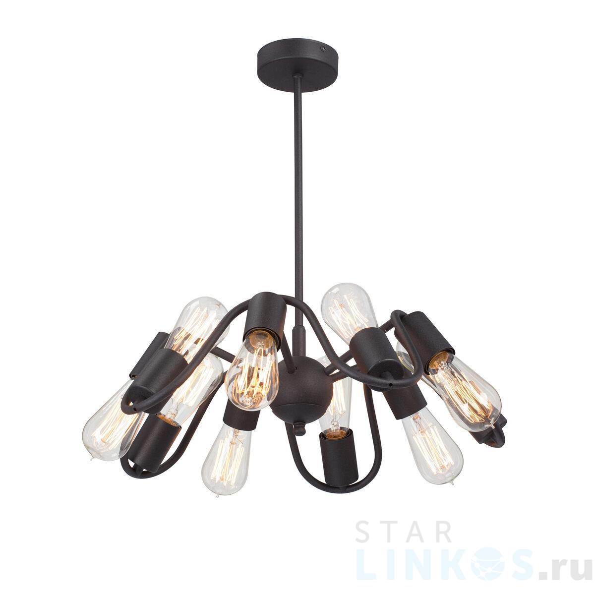 Поставщик рекомендует использовать лампы накаливания с цоколем E27 для освещения площади 30 м2. Подвесная люстра Vitaluce V4005-1/10PL в стиле арт-деко используется в интерьере гостиной с установкой на потолок.