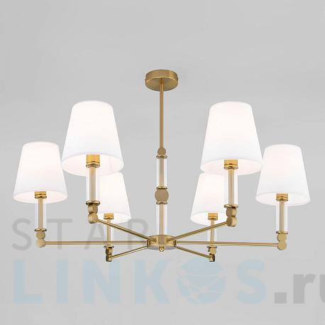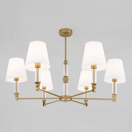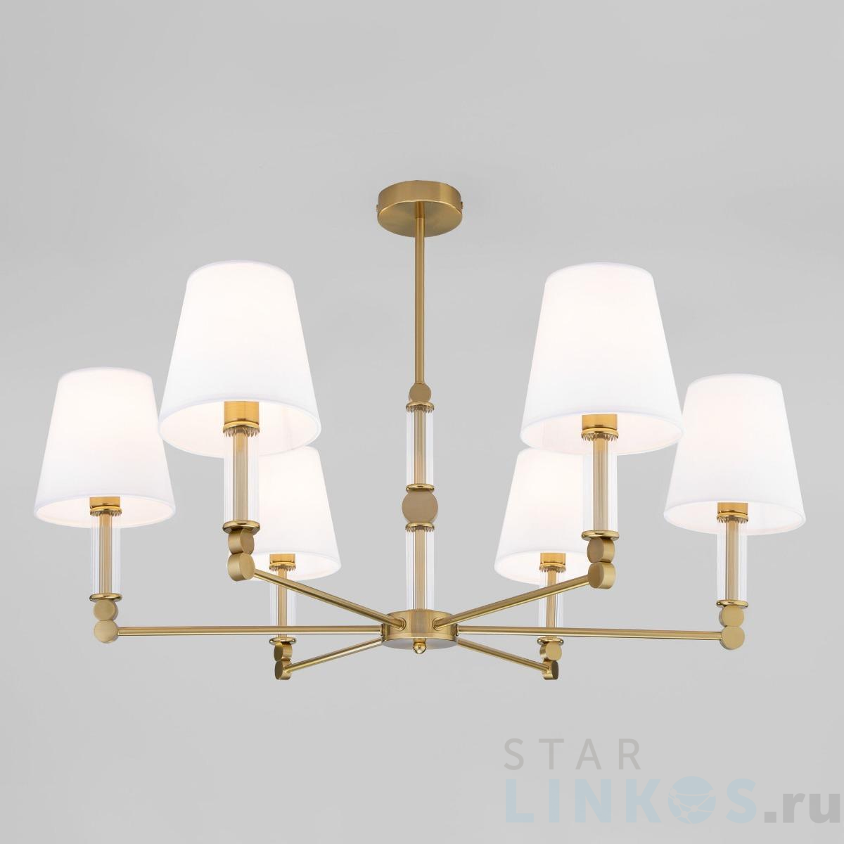 Поставщик рекомендует использовать лампы накаливания с цоколем E14 для освещения площади 11 м2. Потолочная люстра Eurosvet 60145/6 латунь в классическом стиле используется в интерьере гостиной с установкой на потолок.