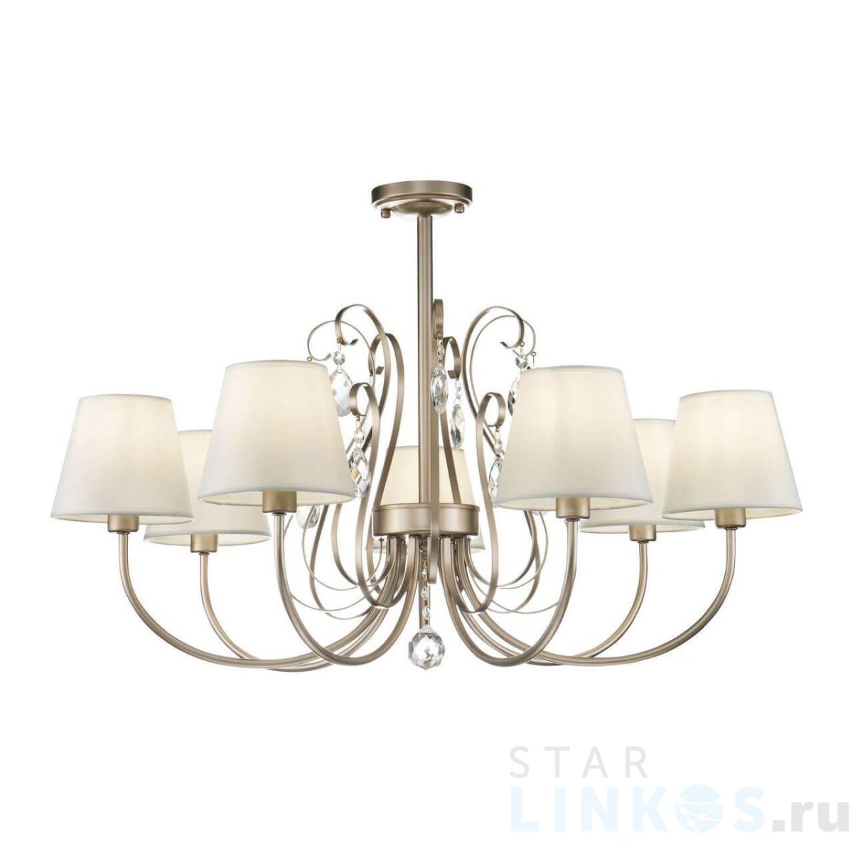 Поставщик рекомендует использовать лампы накаливания с цоколем E14 для освещения площади 15,6 м2. Потолочная люстра Freya Vanda FR2030CL-07G в стиле арт-деко используется в интерьере гостиной с установкой на потолок.
