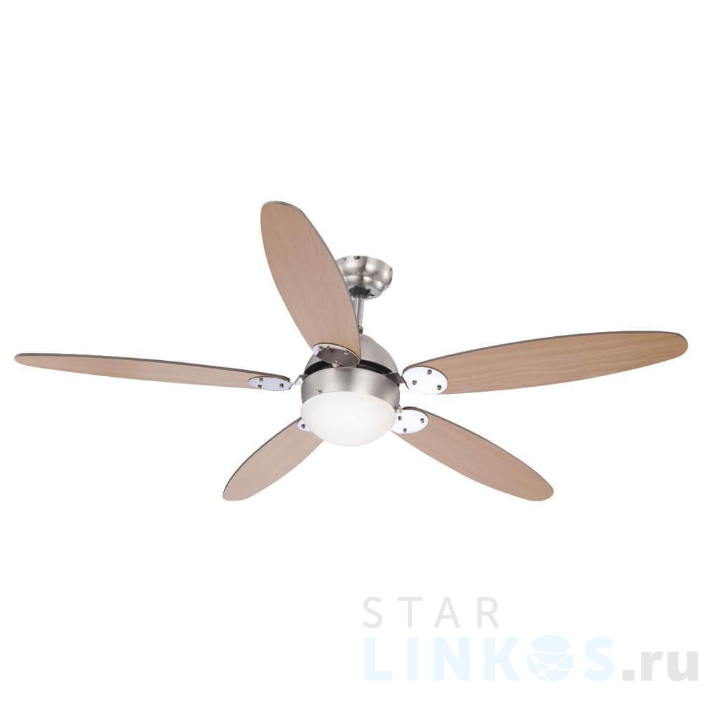 Поставщик рекомендует использовать лампы накаливания с цоколем E14 для освещения площади 3,3 м2. Вентилятор-люстра Globo Azura 0308 в современном стиле используется в интерьере кафе и ресторанов с установкой на потолок.