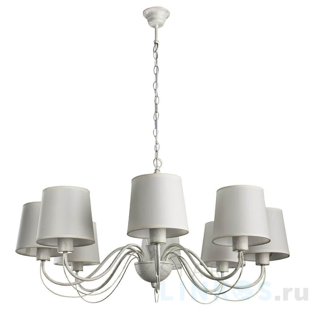 Поставщик рекомендует использовать лампы накаливания с цоколем E27 для освещения площади 17,8 м2. Подвесная люстра Arte Lamp Orlean A9310LM-8WG в стиле прованс используется в интерьере гостиной с установкой на потолок.