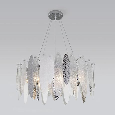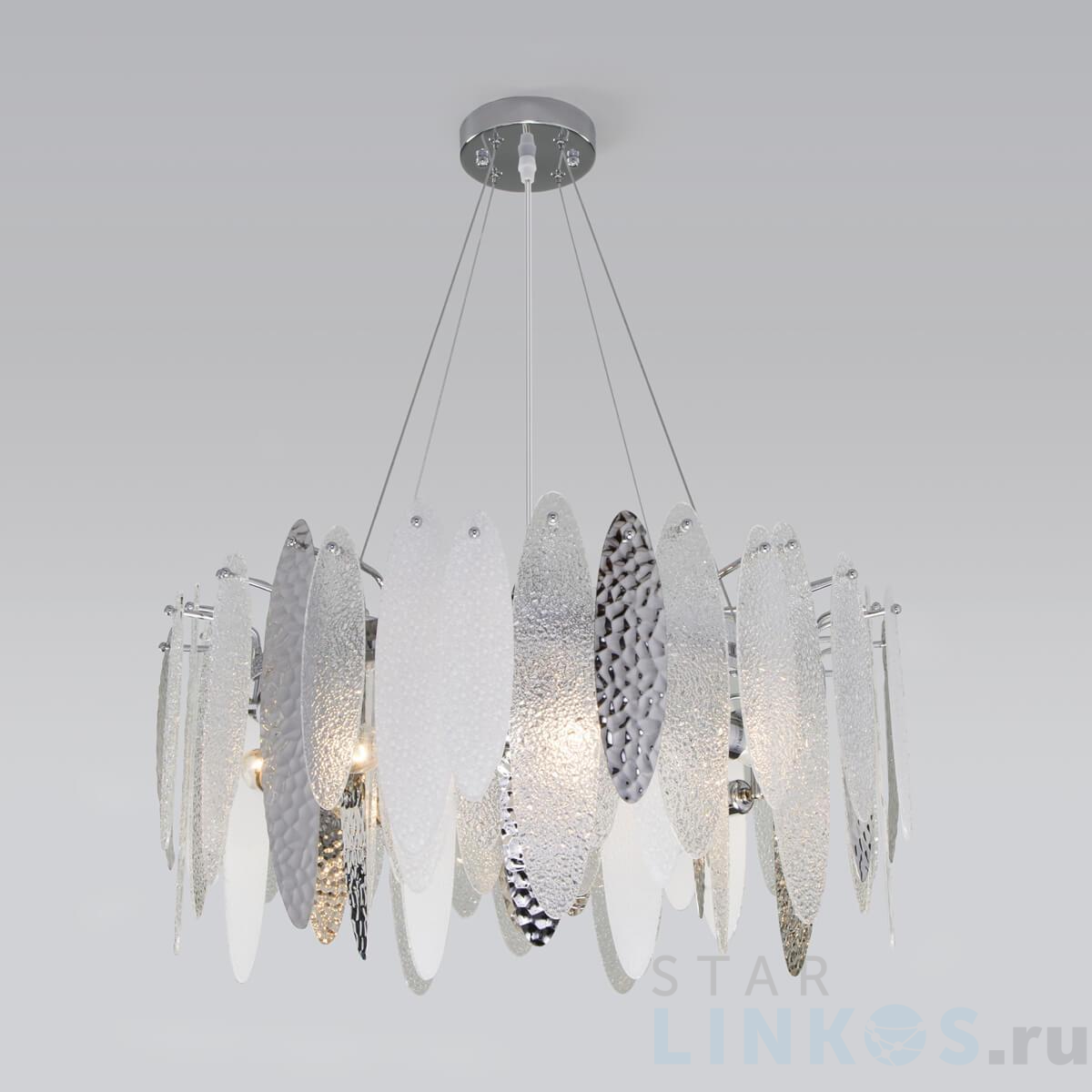 Поставщик рекомендует использовать лампы накаливания с цоколем E14 для освещения площади 26,7 м2. Подвесная люстра Bogates Canaria 324/8 в стиле арт-деко используется в интерьере гостиной с установкой на потолок.