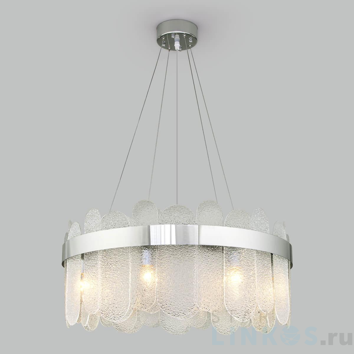 Поставщик рекомендует использовать лампы накаливания с цоколем E14 для освещения площади 26,7 м2. Подвесная люстра Bogates Conte 333/8 в современном стиле используется в интерьере гостиной с установкой на потолок.