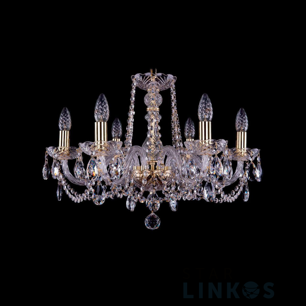 Поставщик рекомендует использовать лампы накаливания с цоколем E14 для освещения площади 13,3 м2. Подвесная люстра Bohemia Ivele 1402/6/195 G в классическом стиле используется в интерьере гостиной с установкой на потолок.