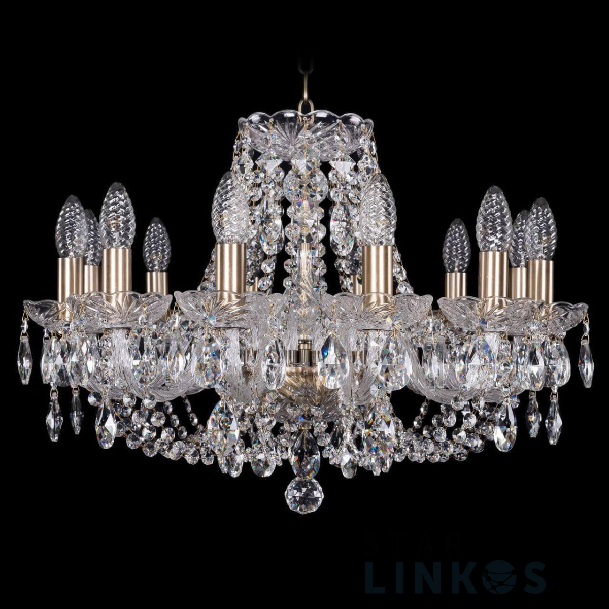 Поставщик рекомендует использовать лампы накаливания с цоколем E14 для освещения площади 26,7 м2. Подвесная люстра Bohemia Ivele 1406/12/195 Pa в классическом стиле используется в интерьере гостиной с установкой на потолок.