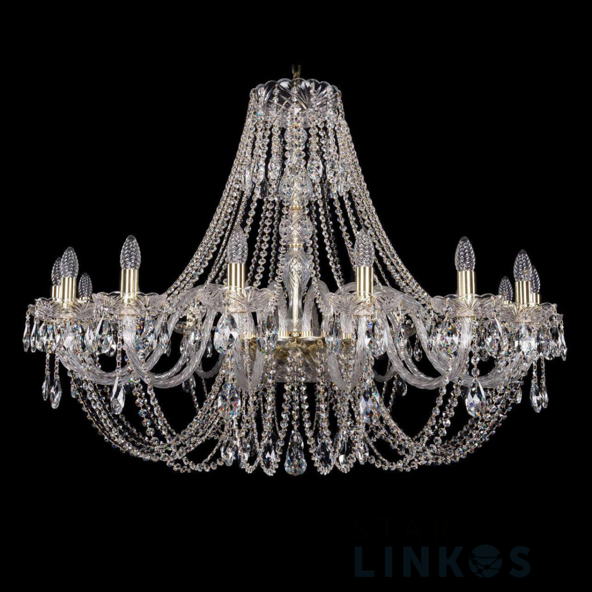 Поставщик рекомендует использовать лампы накаливания с цоколем E14 для освещения площади 35,6 м2. Подвесная люстра Bohemia Ivele 1406/16/400 G в классическом стиле используется в интерьере больших залов с установкой на потолок.