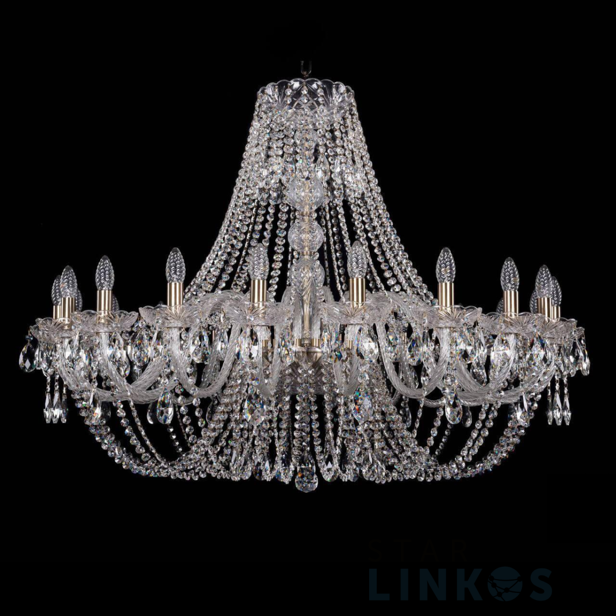 Поставщик рекомендует использовать лампы накаливания с цоколем E14 для освещения площади 44,4 м2. Подвесная люстра Bohemia Ivele 1406/20/400 Pa в классическом стиле используется в интерьере больших залов с установкой на потолок.