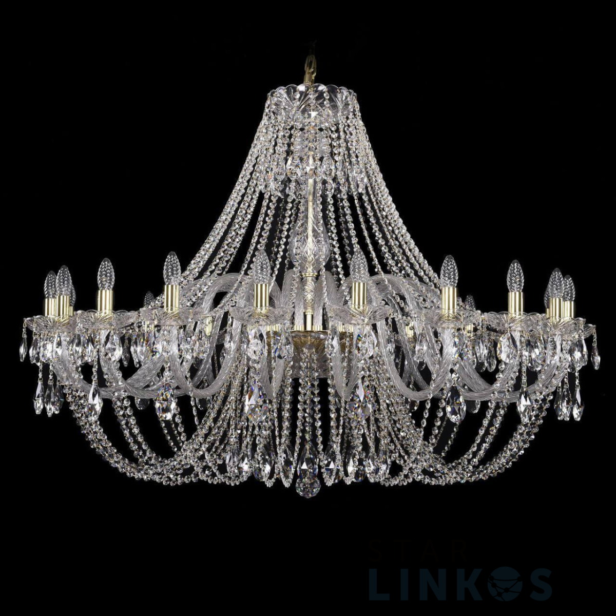 Поставщик рекомендует использовать лампы накаливания с цоколем E14 для освещения площади 44,4 м2. Подвесная люстра Bohemia Ivele 1406/20/460 G в классическом стиле используется в интерьере больших залов с установкой на потолок.