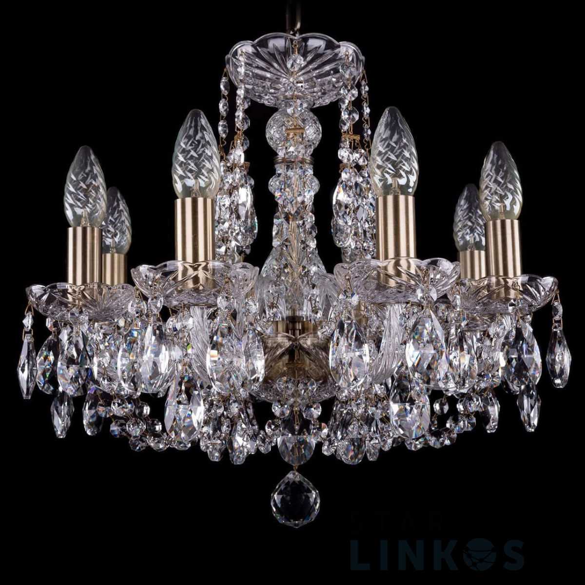 Поставщик рекомендует использовать лампы накаливания с цоколем E14 для освещения площади 17,8 м2. Подвесная люстра Bohemia Ivele 1406/8/141 Pa в классическом стиле используется в интерьере гостиной с установкой на потолок.