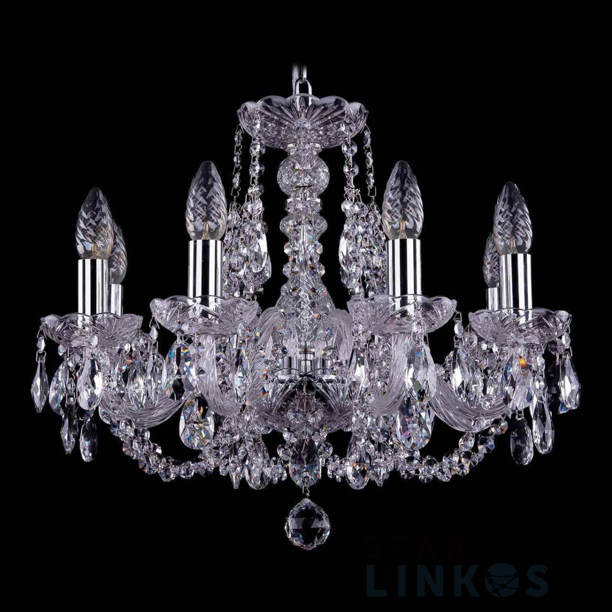 Поставщик рекомендует использовать лампы накаливания с цоколем E14 для освещения площади 17,8 м2. Подвесная люстра Bohemia Ivele 1406/8/160 Ni в классическом стиле используется в интерьере гостиной с установкой на потолок.