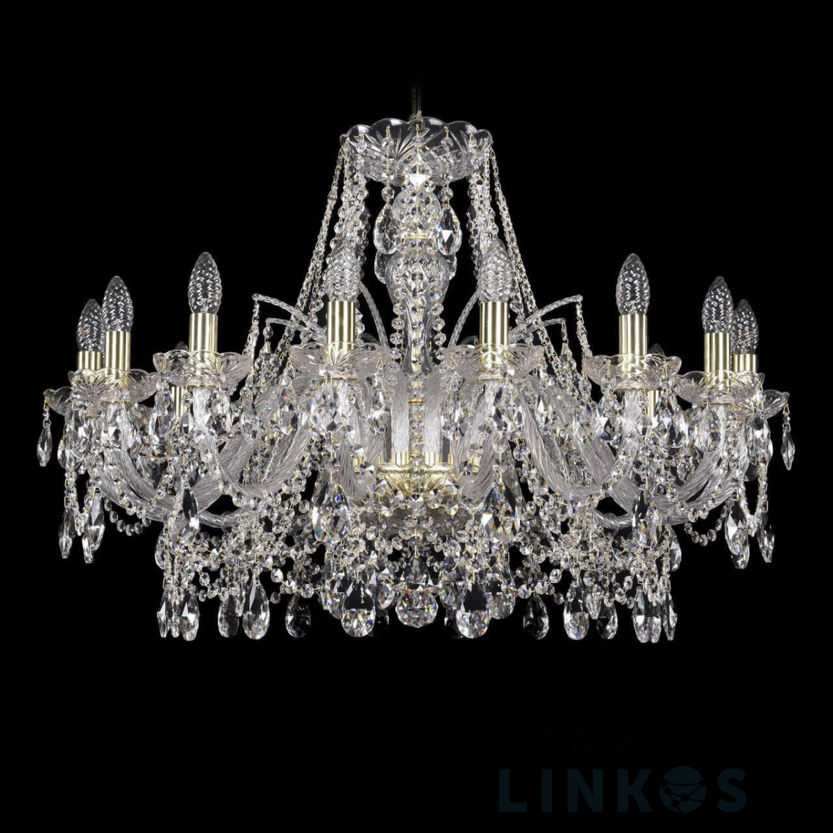 Поставщик рекомендует использовать лампы накаливания с цоколем E14 для освещения площади 35,6 м2. Подвесная люстра Bohemia Ivele 1411/16/300 G в классическом стиле используется в интерьере больших залов с установкой на потолок.