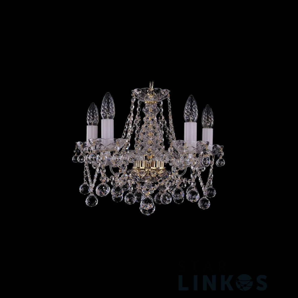 Поставщик рекомендует использовать лампы накаливания с цоколем E14 для освещения площади 11,1 м2. Подвесная люстра Bohemia Ivele 1413/5/141 G в классическом стиле используется в интерьере спальни с установкой на потолок.