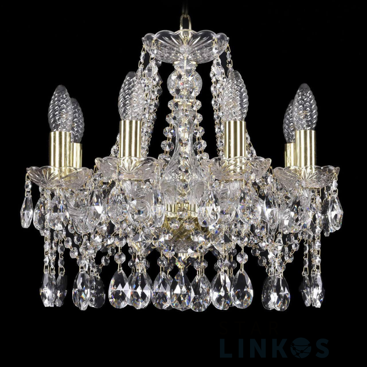 Поставщик рекомендует использовать лампы накаливания с цоколем E14 для освещения площади 17,8 м2. Подвесная люстра Bohemia Ivele 1413/8/141 G в классическом стиле используется в интерьере гостиной с установкой на потолок.