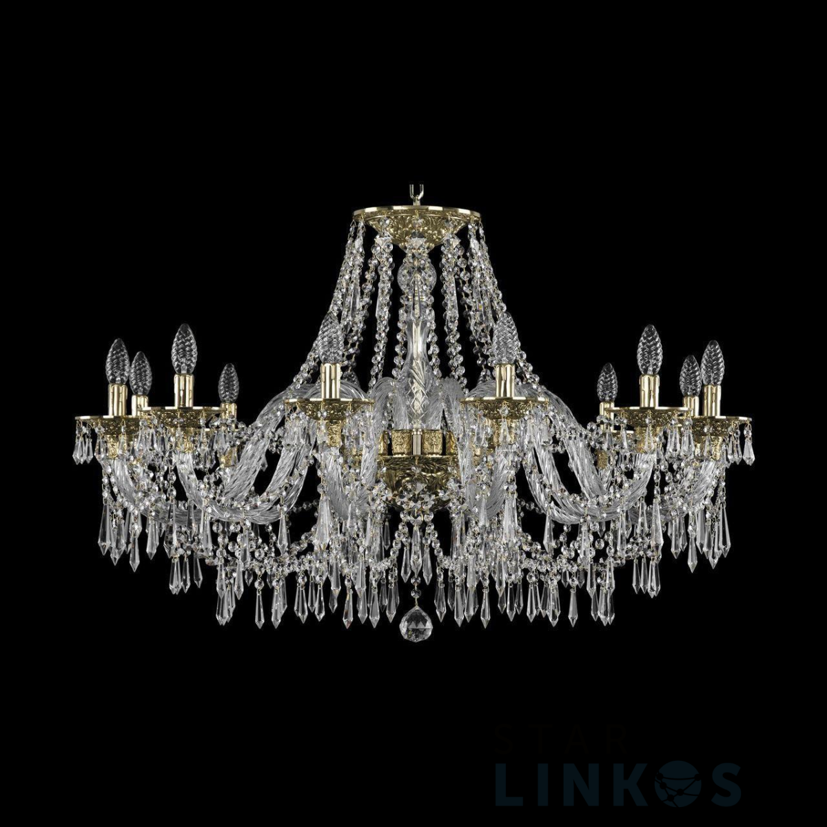 Поставщик рекомендует использовать лампы накаливания с цоколем E14 для освещения площади 32 м2. Подвесная люстра Bohemia Ivele 16103/12/360 G в классическом стиле используется в интерьере гостиной с установкой на потолок.