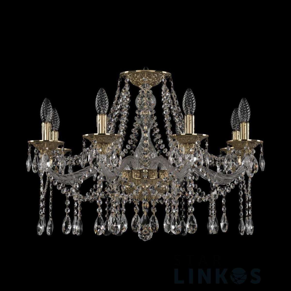 Поставщик рекомендует использовать лампы накаливания с цоколем E14 для освещения площади 22 м2. Подвесная люстра Bohemia Ivele 16113/8/240 G в классическом стиле используется в интерьере гостиной с установкой на потолок.