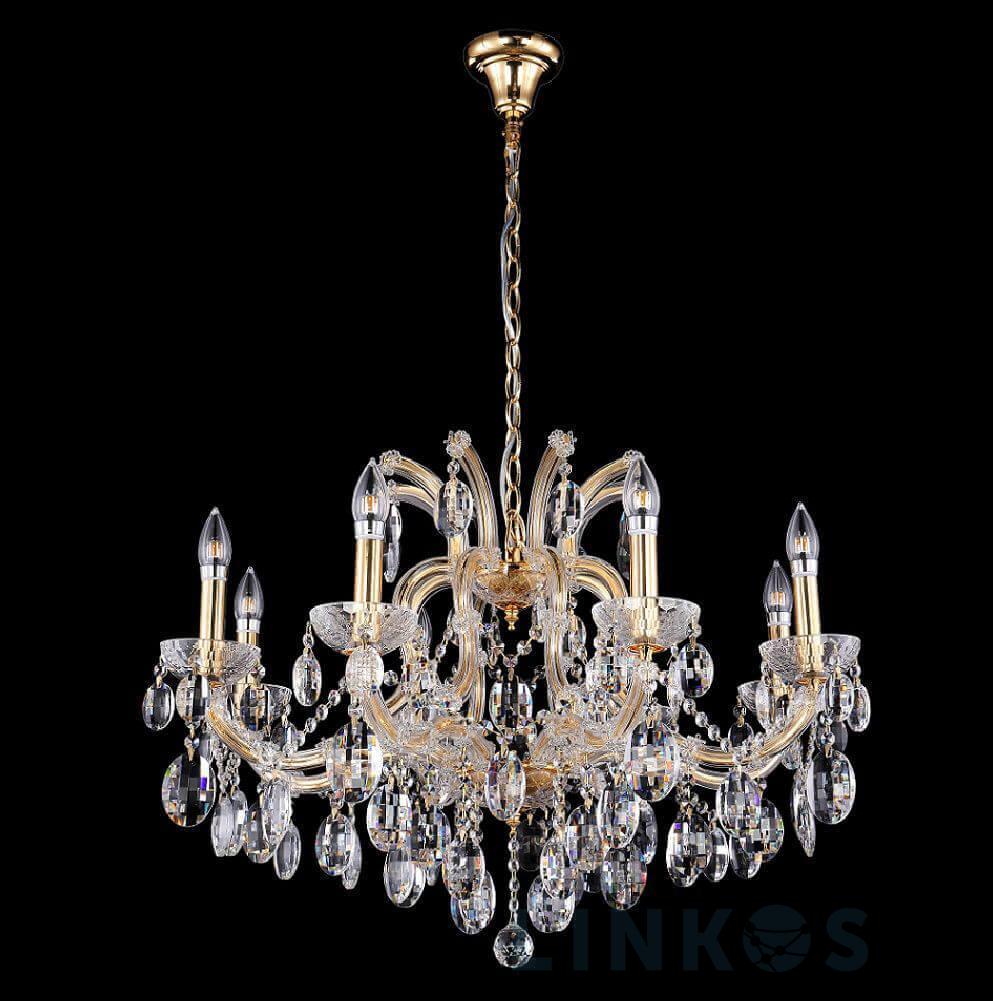 Поставщик рекомендует использовать лампы накаливания с цоколем E14 для освещения площади 17,8 м2. Подвесная люстра Crystal Lux Hollywood SP8 Gold в классическом стиле используется в интерьере гостиной с установкой на потолок.