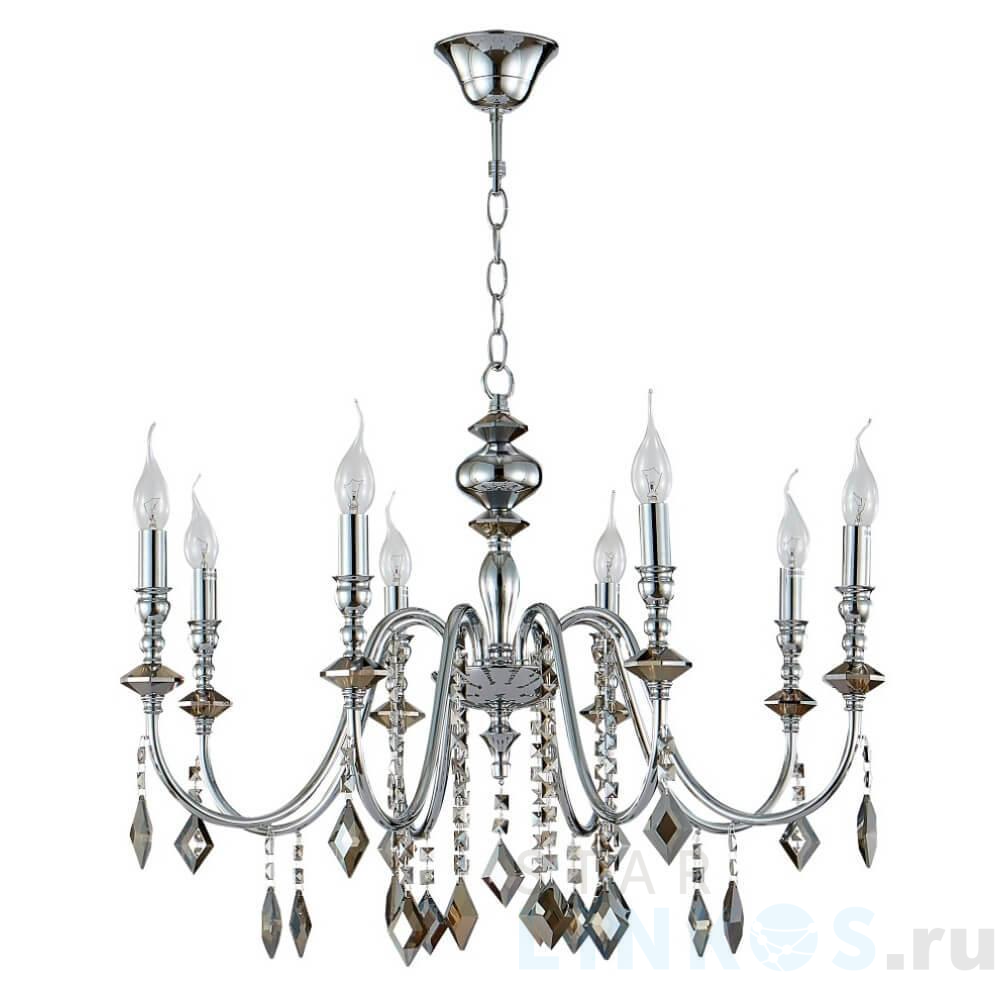 Поставщик рекомендует использовать лампы накаливания с цоколем E14. Подвесная люстра Crystal Lux MERCEDES SP8 CHROME/SMOKE в стиле арт-деко используется в интерьере гостиной с установкой на потолок.