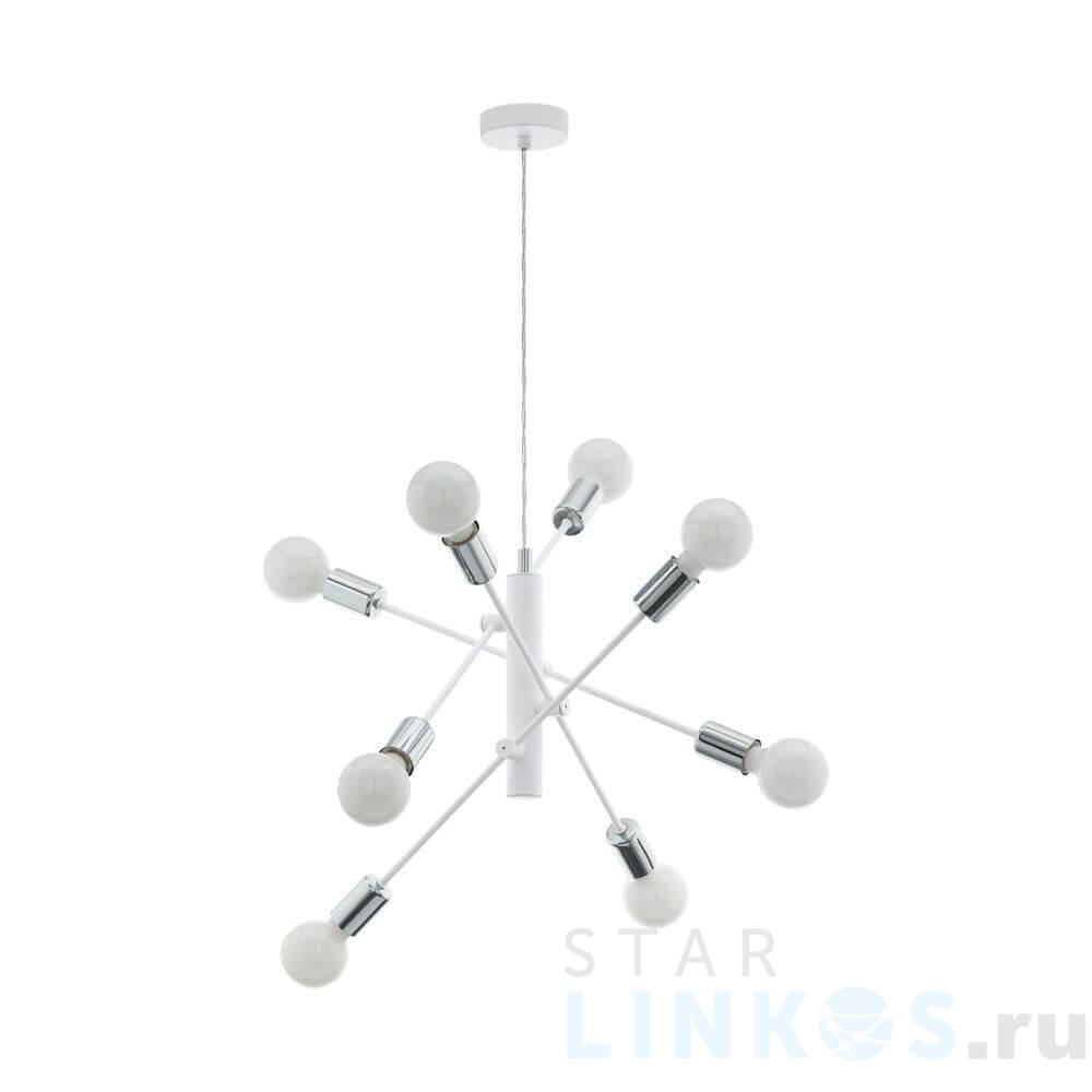 Поставщик рекомендует использовать лампы накаливания с цоколем E27 для освещения площади 26,7 м2. Подвесная люстра Eglo Gradoli 98017 в используется в интерьере гостиной с установкой на потолок.