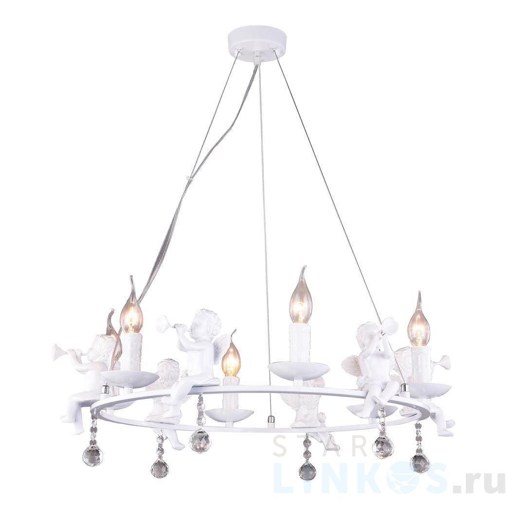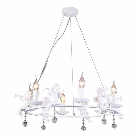 Поставщик рекомендует использовать лампы накаливания с цоколем E14 для освещения площади 20 м2. Подвесная люстра Escada 10169/6 в используется в интерьере спальни с установкой на потолок.