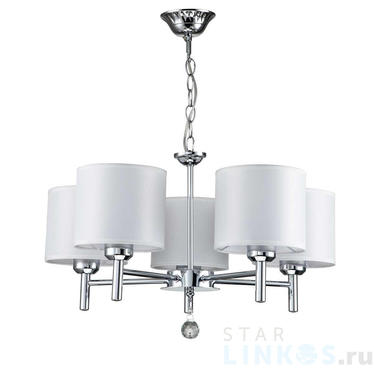 Поставщик рекомендует использовать лампы накаливания с цоколем E27 для освещения площади 10 м2. Подвесная люстра Escada Adora 1143/5PL в используется в интерьере спальни с установкой на потолок.
