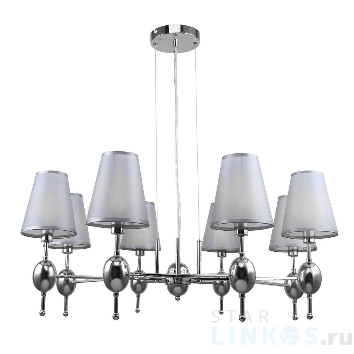 Поставщик рекомендует использовать лампы накаливания с цоколем E14 для освещения площади 20 м2. Подвесная люстра Escada Elegy 2106/8S в используется в интерьере гостиной с установкой на потолок.