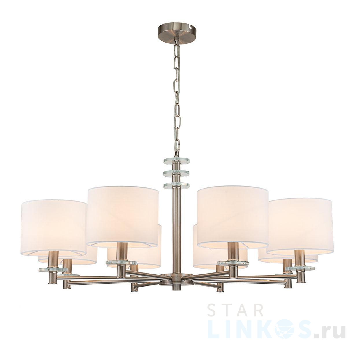 Поставщик рекомендует использовать лампы накаливания с цоколем E14 для освещения площади 30 м2. Подвесная люстра Escada Novella 641/8PL в используется в интерьере гостиной с установкой на потолок.