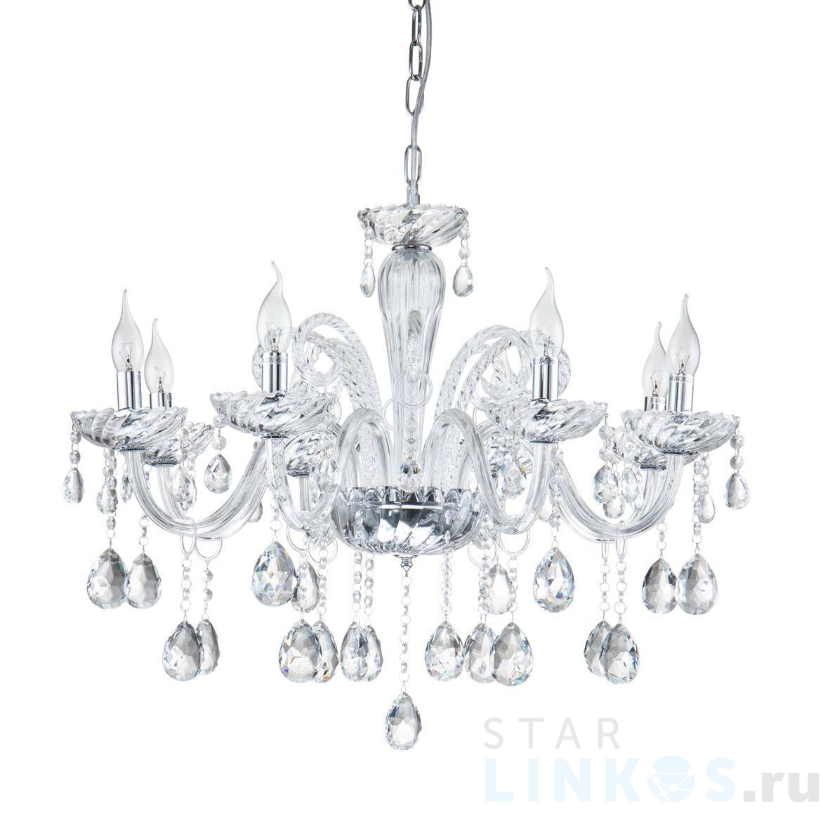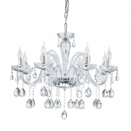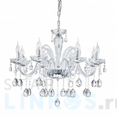 Поставщик рекомендует использовать лампы накаливания с цоколем E14 для освещения площади 17,8 м2. Подвесная люстра Escada Premium Line 685/8S в классическом стиле используется в интерьере гостиной с установкой на потолок.