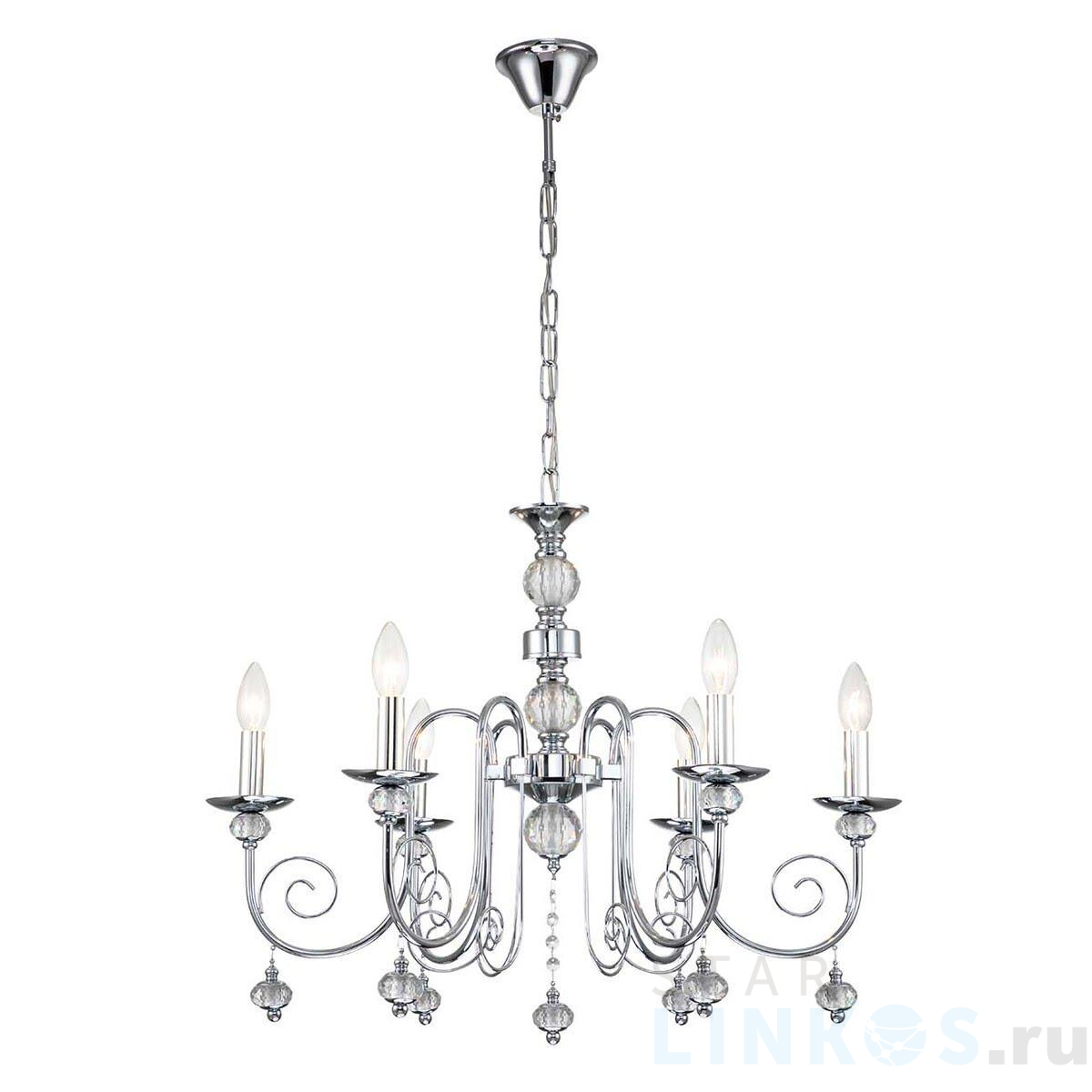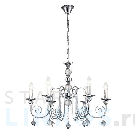 Поставщик рекомендует использовать лампы накаливания с цоколем E14 для освещения площади 12 м2. Подвесная люстра Escada Shine 678/6PL Chrome в классическом стиле используется в интерьере гостиной с установкой на потолок.