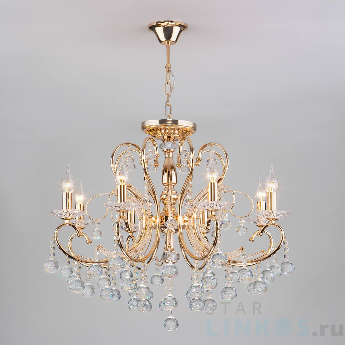 Поставщик рекомендует использовать лампы накаливания с цоколем E14. Подвесная люстра Eurosvet 10096/8 золото в классическом стиле используется в интерьере гостиной с установкой на потолок.