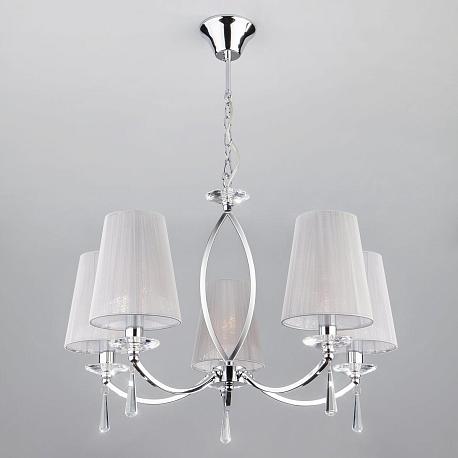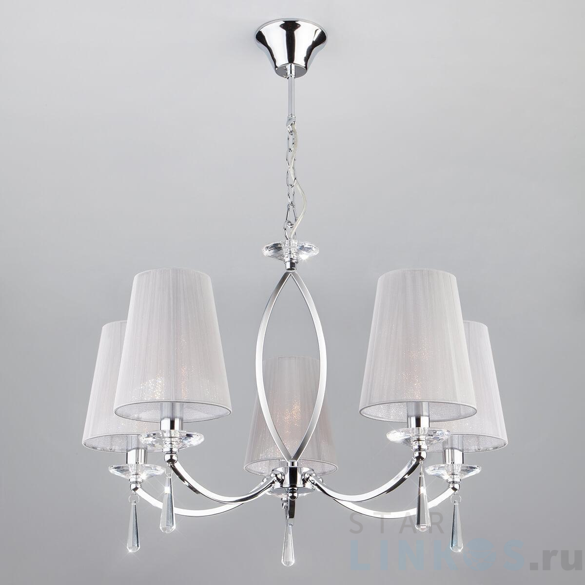 Поставщик рекомендует использовать лампы накаливания с цоколем E14 для освещения площади 11,1 м2. Подвесная люстра Eurosvet 60079/5 хром в используется в интерьере спальни с установкой на потолок.