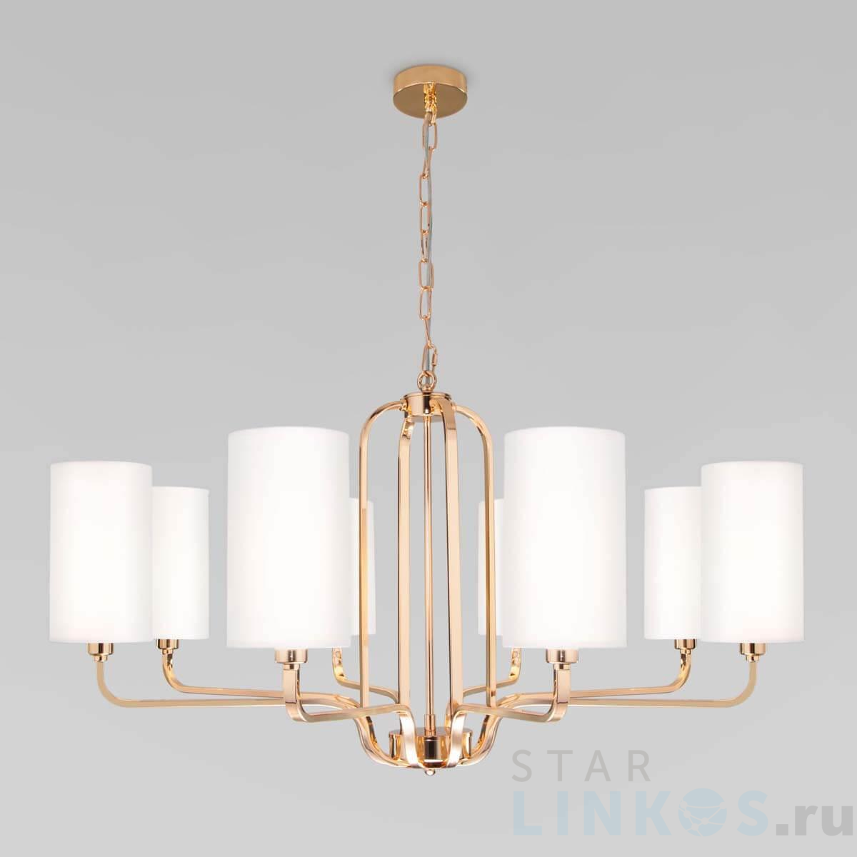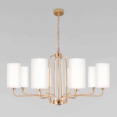 Поставщик рекомендует использовать лампы накаливания с цоколем E14. Подвесная люстра Eurosvet 60128/8 золото в современном стиле используется в интерьере гостиной с установкой на потолок.