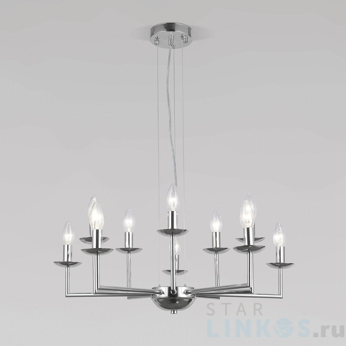 Поставщик рекомендует использовать лампы накаливания с цоколем E14 для освещения площади 18 м2. Подвесная люстра Eurosvet Cariso 60150/10 хром в используется в интерьере гостиной с установкой на потолок.