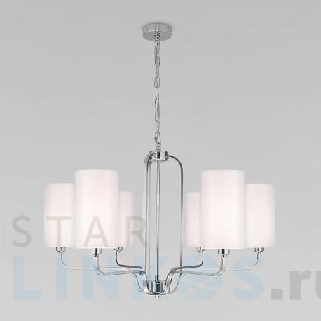 Поставщик рекомендует использовать лампы накаливания с цоколем E14 для освещения площади 12 м2. Подвесная люстра Eurosvet Purezza 60128/6 хром в используется в интерьере спальни с установкой на потолок.