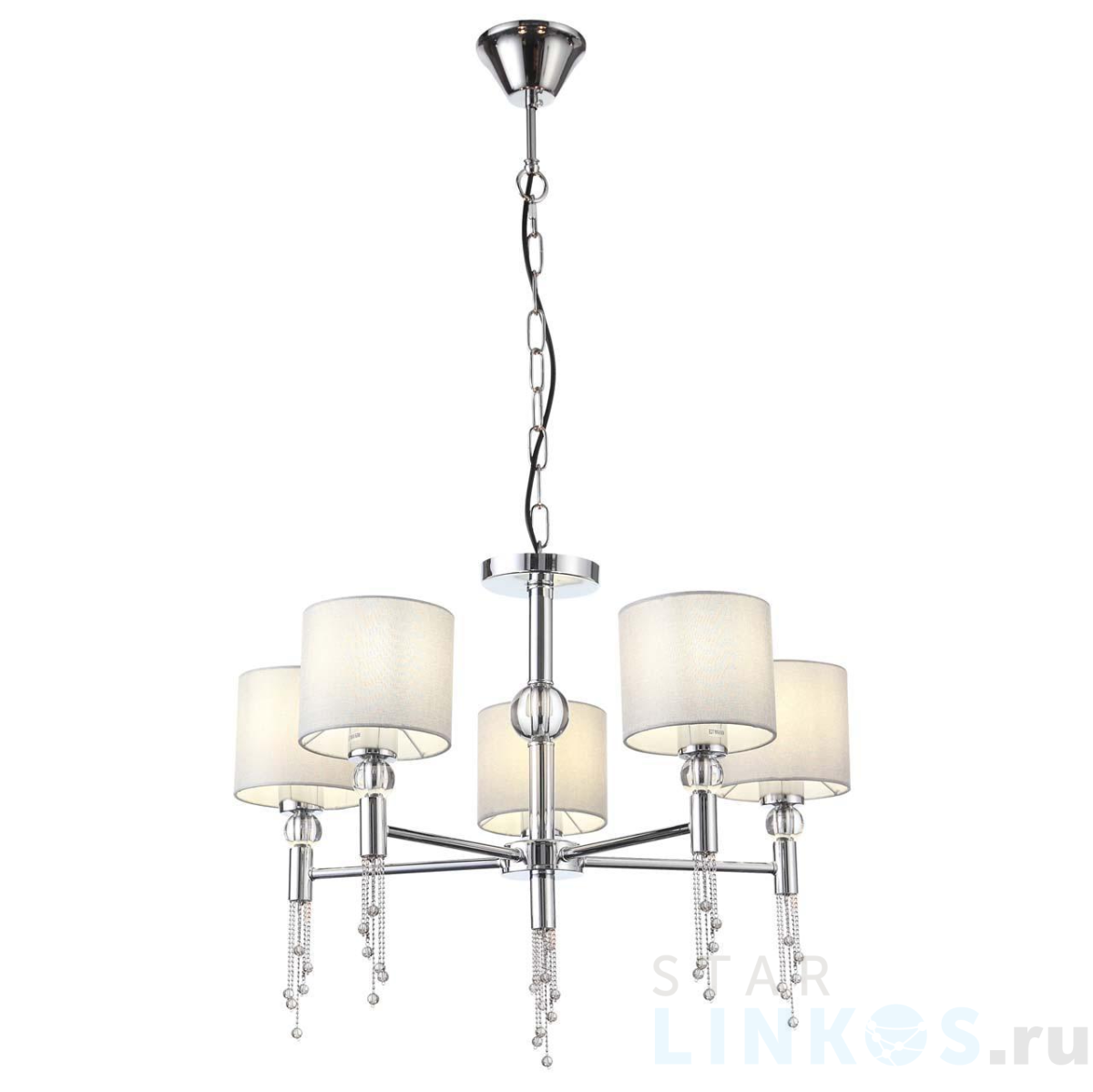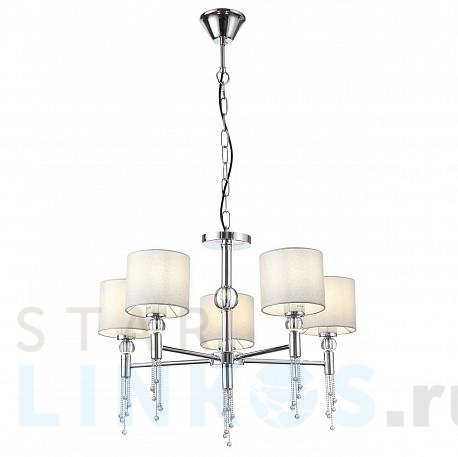 Поставщик рекомендует использовать лампы накаливания с цоколем E27 для освещения площади 16,7 м2. Подвесная люстра Evoluce Primma SLE105173-05 в классическом стиле используется в интерьере спальни с установкой на потолок.