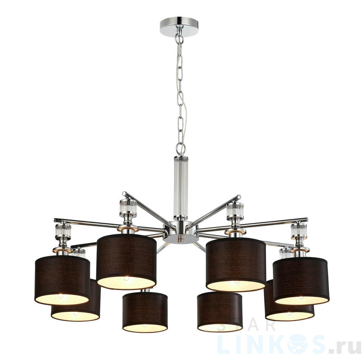 Поставщик рекомендует использовать лампы накаливания с цоколем E14 для освещения площади 17,8 м2. Подвесная люстра Favourite Archetypus 2674-8P в современном стиле используется в интерьере гостиной с установкой на потолок.