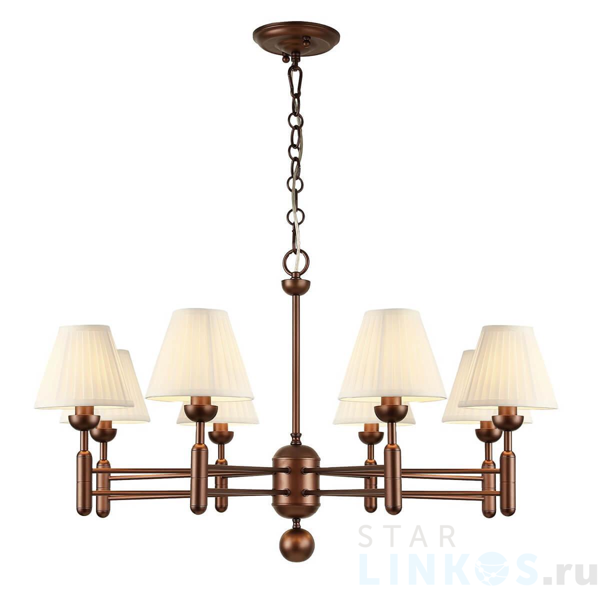Поставщик рекомендует использовать лампы накаливания с цоколем E14 для освещения площади 16 м2. Подвесная люстра Favourite Avangard 2953-8P в используется в интерьере спальни с установкой на потолок.