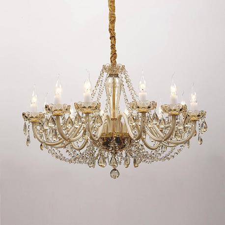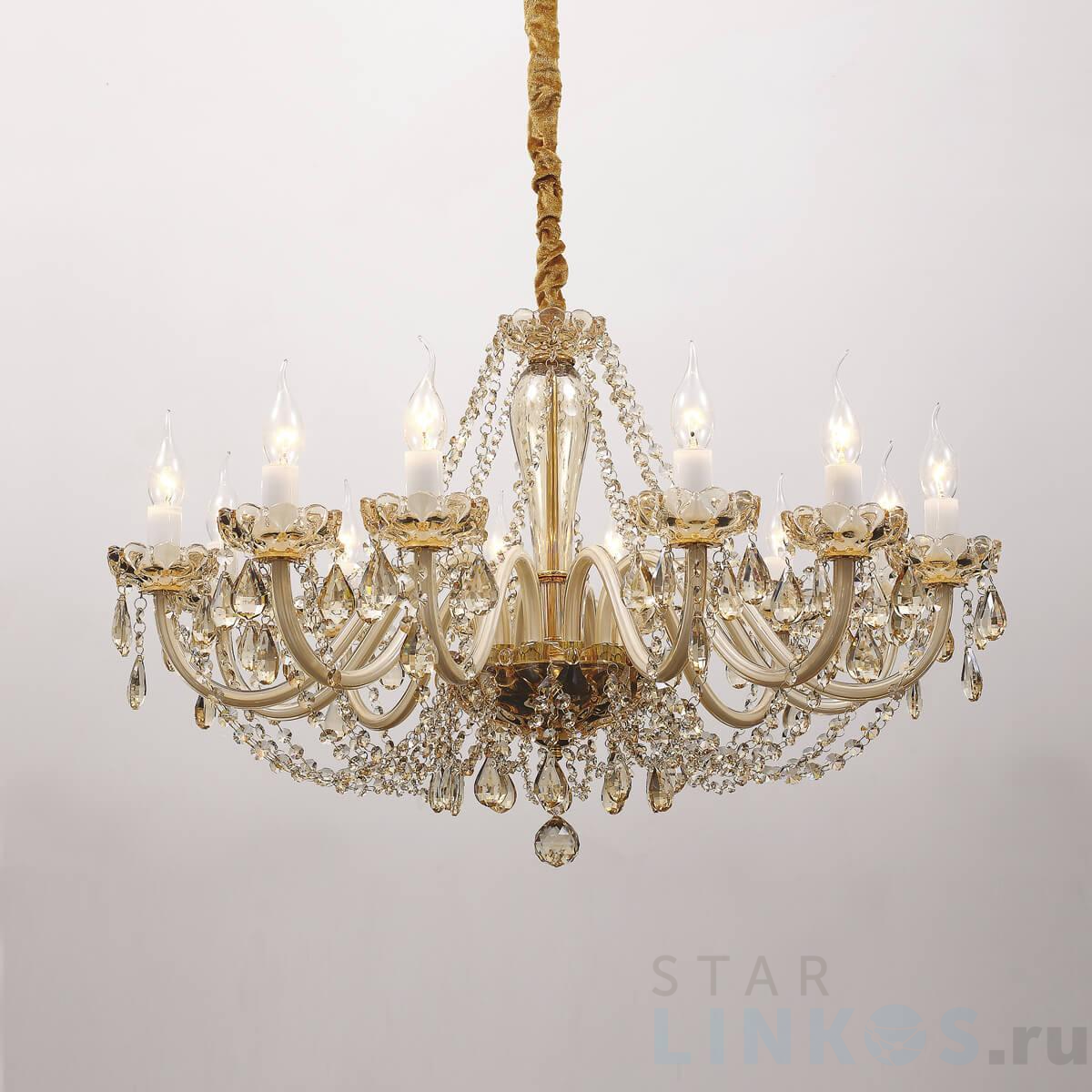 Поставщик рекомендует использовать лампы накаливания с цоколем E14 для освещения площади 26,7 м2. Подвесная люстра Favourite Brendy 1738-12P в классическом стиле используется в интерьере гостиной с установкой на потолок.