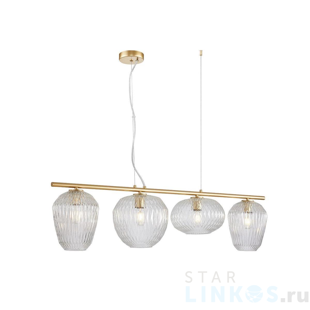 Поставщик рекомендует использовать лампы накаливания с цоколем E27 для освещения площади 12 м2. Подвесная люстра Favourite Comical 4053-4P в используется в интерьере кухни с установкой на потолок.