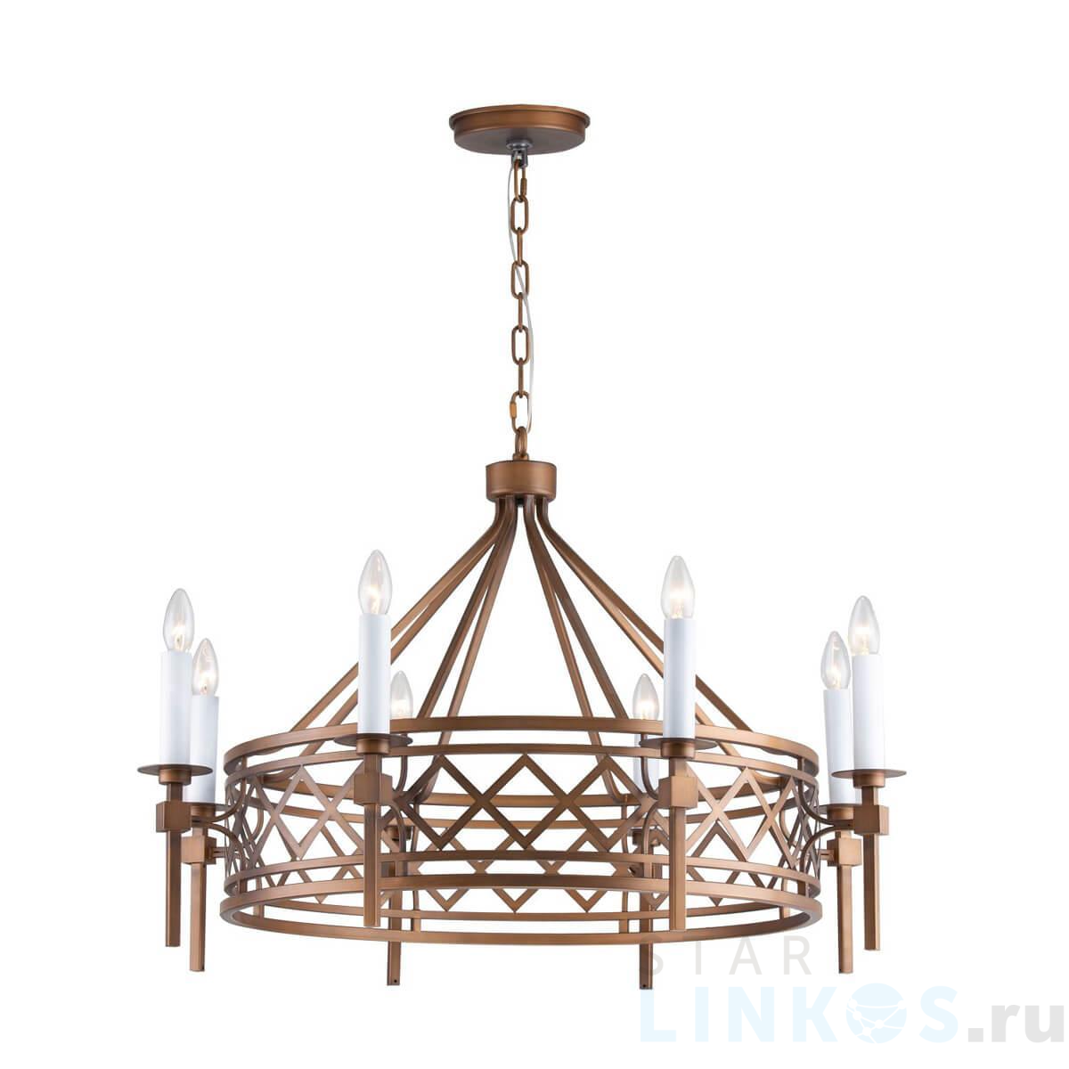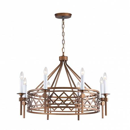Поставщик рекомендует использовать лампы накаливания с цоколем E14 для освещения площади 17,8 м2. Подвесная люстра Favourite Eques 2878-8P в кантри-стиле используется в интерьере гостиной с установкой на потолок.
