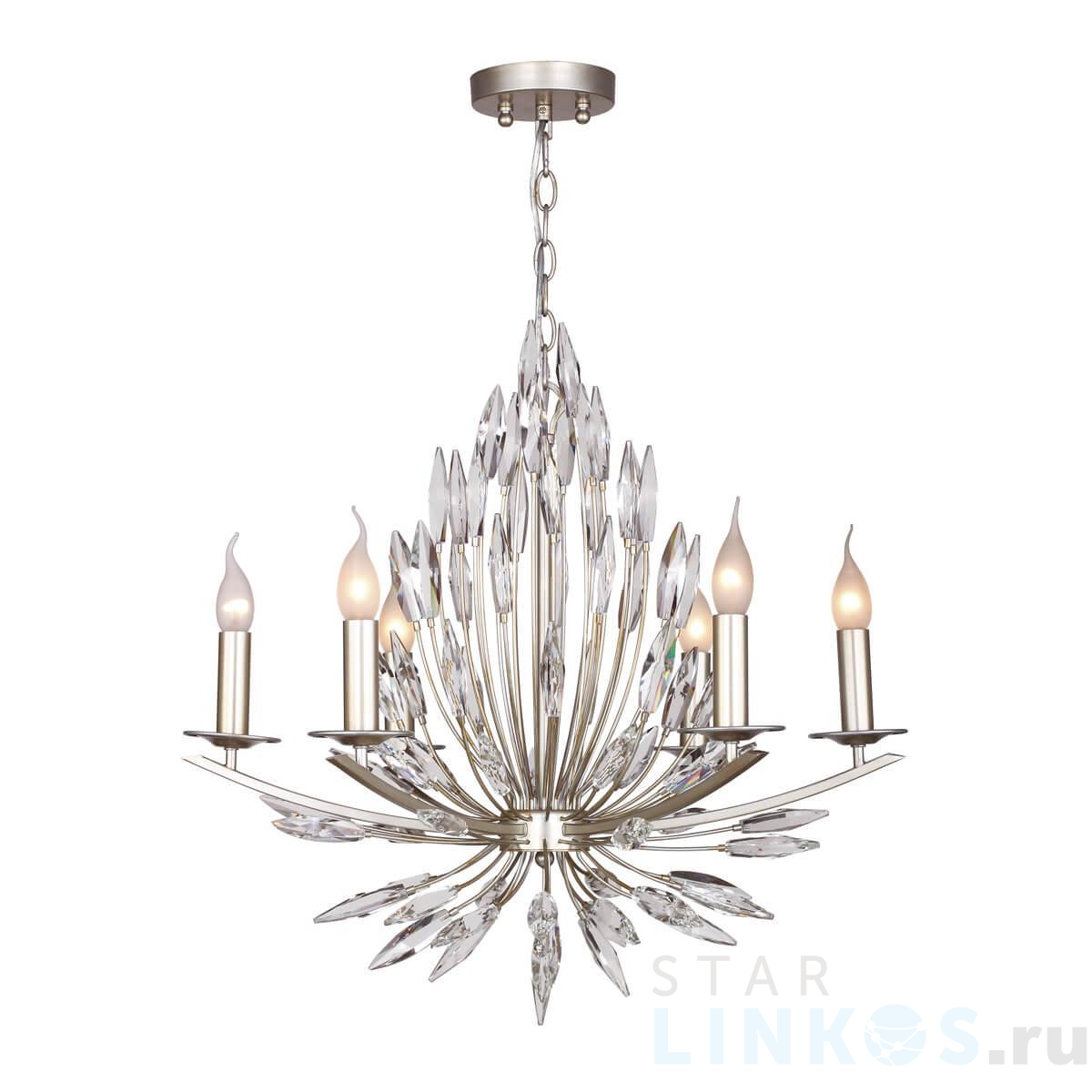 Поставщик рекомендует использовать лампы накаливания с цоколем E14 для освещения площади 13,3 м2. Подвесная люстра Favourite Feerie 1932-6P в используется в интерьере спальни с установкой на потолок.